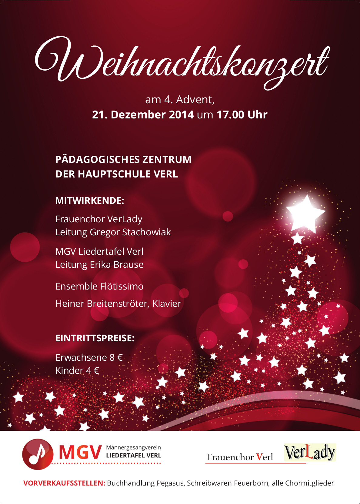 Wir möchten Sie als Freunde der Chormusik zu unserem traditionellen Weihnachtskonzert recht herzlich einladen. Es findet am Sonntag, 21.12.2014 um 17:00 Uhr im Pädagogischen Zentrum der Hauptschule in Verl statt. Eintrittskarten sind zum Preis von 8,00 € für Erwachsene und 4,00 € für Kinder ab dem 1. Dezember 2014 bei unseren oder bei den Chormitgliedern des Frauenchores VerLady oder bei der Buchhandlung Pegasus und Schreibwaren Feuerborn erhältlich.